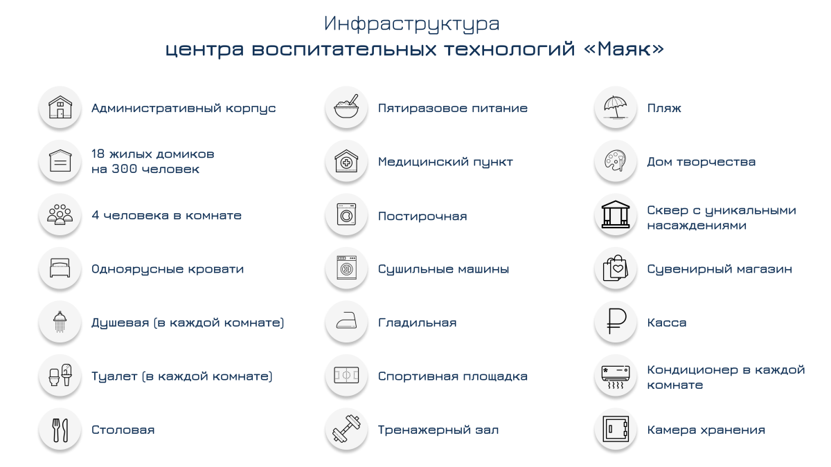 Общая вместимость центра воспитательных технологий «Маяк» составляет 300 человек, жилые комнаты рассчитаны на четыре места. Каждая комната оборудована кондиционером, санитарным блоком.