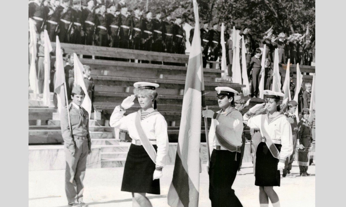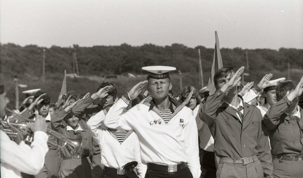 - праздник открытия слёта - парад юных моряков, где ребятам вручили военно-морской флаг, который принимали штурвальные слёта - Витя Милюхин (респ. Якутия) и Света Комракова (Томская область).